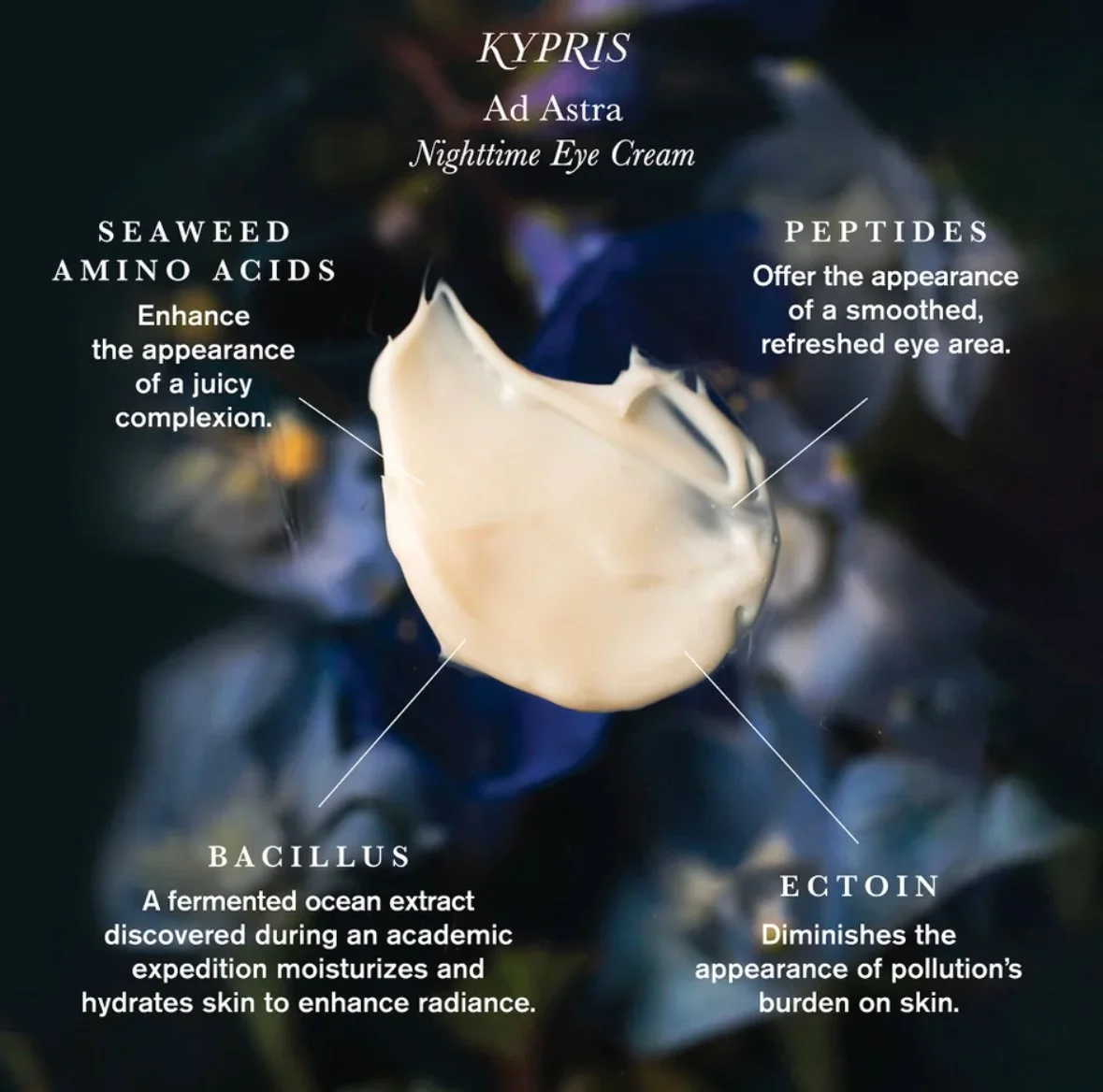 How to Use With kind eyes and gentle hands, pat a thin layer of Ad Astra in crescent shapes above and below the eye beginning from the eye's inner corner tracing up to the brow bone and down to the eye's outer corner. Excess may be applied between eyebrows, across forehead, or around mouth. For best results, follow with your favorite KYPRIS Serums, Elixirs, & Moisturizers. For external use only.