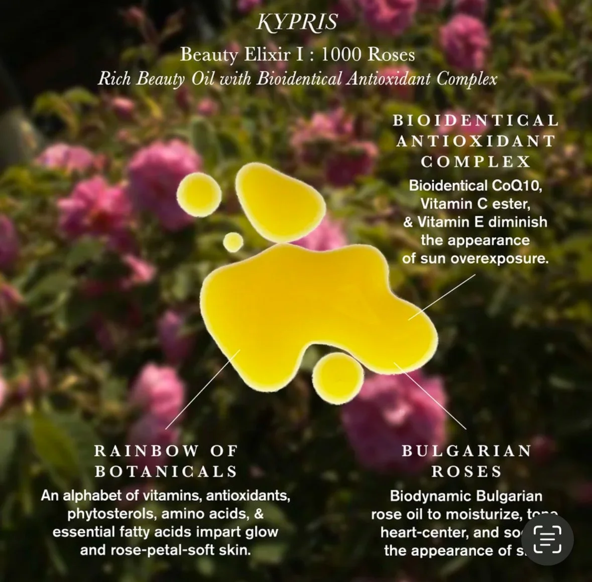 Beauty Elixir I: 1,000 Roses is a moisturizing, multi-active beauty oil. Bio-identical CoQ10, Vitamin C Ester, & sustainably sourced botanicals including Bulgarian rose essential oil diminish the appearance of dryness and UV overexposure for glowing, rose-petal-soft skin.