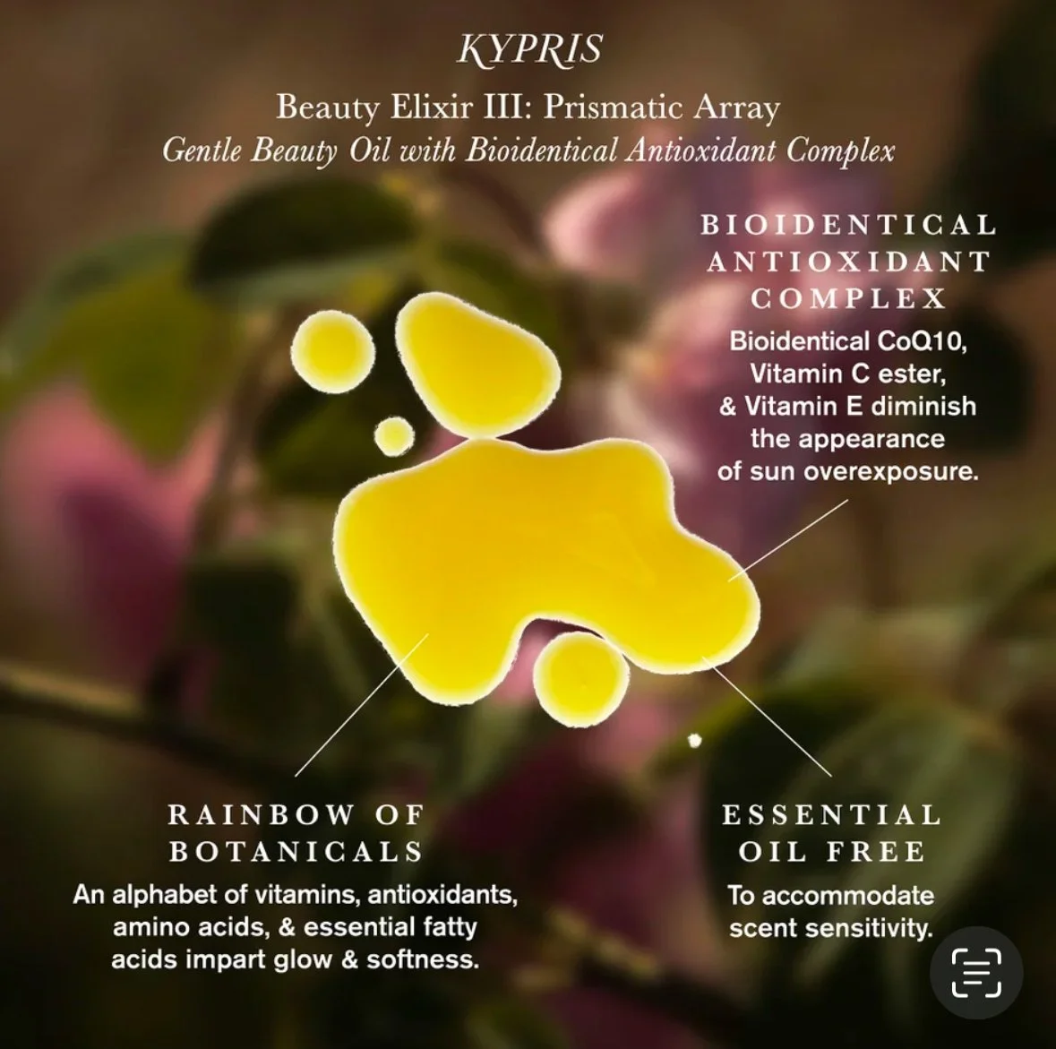As you anoint your skin with 2 to 5 drops of Beauty Elixir morning and night, offer yourself an honest compliment. For best results, apply Beauty Elixir AM & PM in combination with your favorite KYPRIS serums. For external use only.